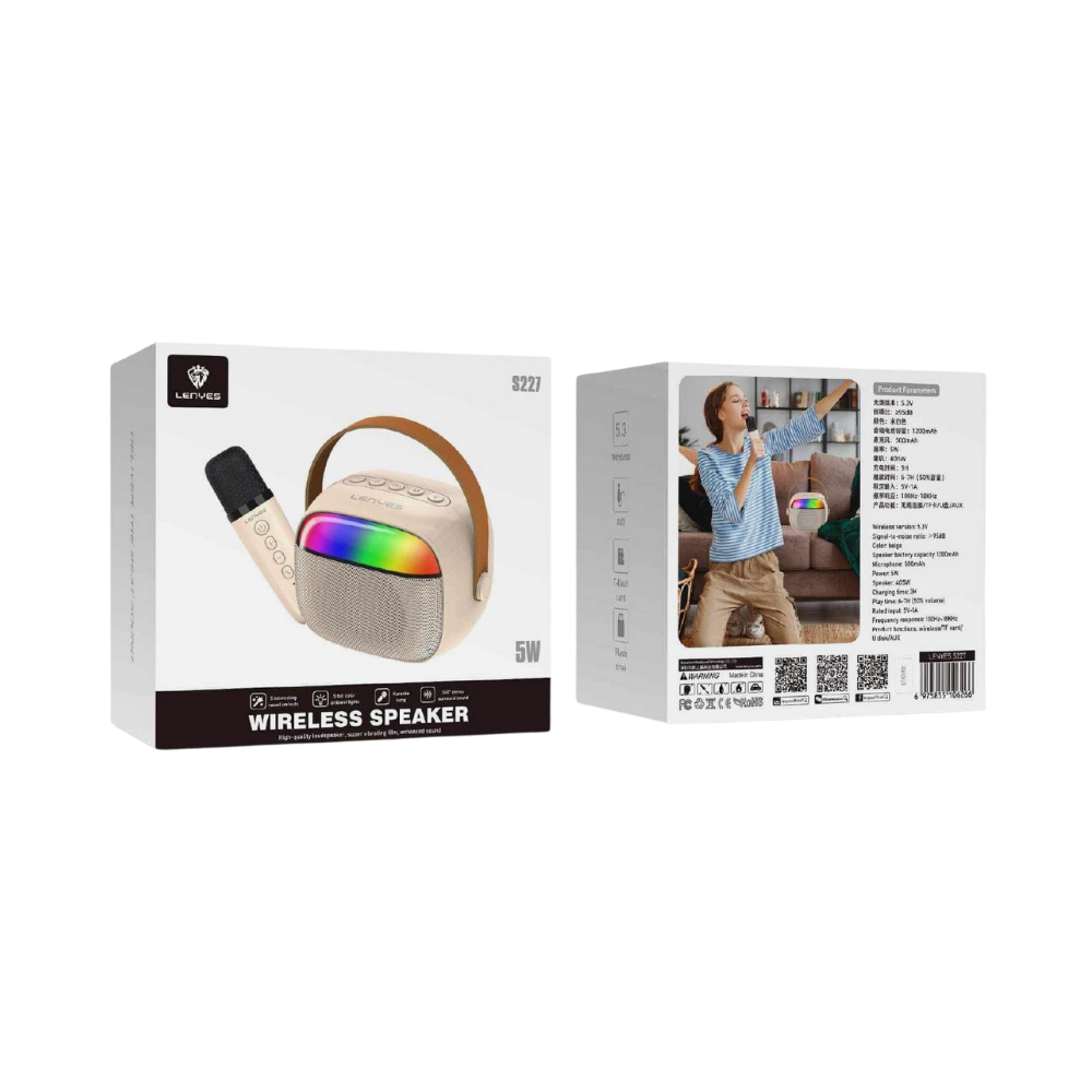 Transforma cada reunión en una experiencia musical con el parlante Lenyes S229. Un equipo que combina bluetooth 5.3, micrófono incluido, efectos de luz RGB y diseño colgante, para que la diversión vaya contigo.